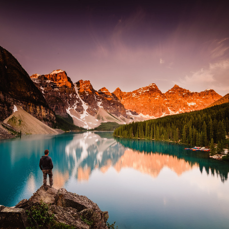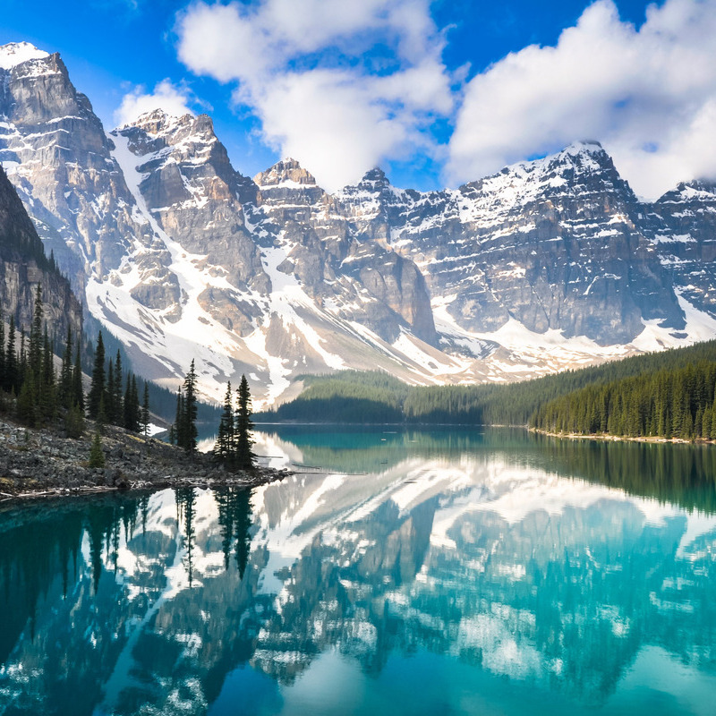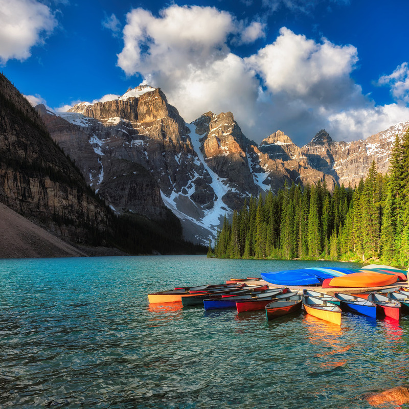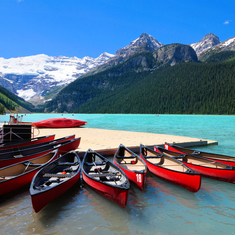 Gelegen op 60 km van Banff, bevindt zicht één van de meest iconische en adembenemende meren ter wereld. Het helderblauwe water, gevoed door gletsjers, weerspiegelt de omringende torenhoge bergen en het majestueuze Victoria Glacier.