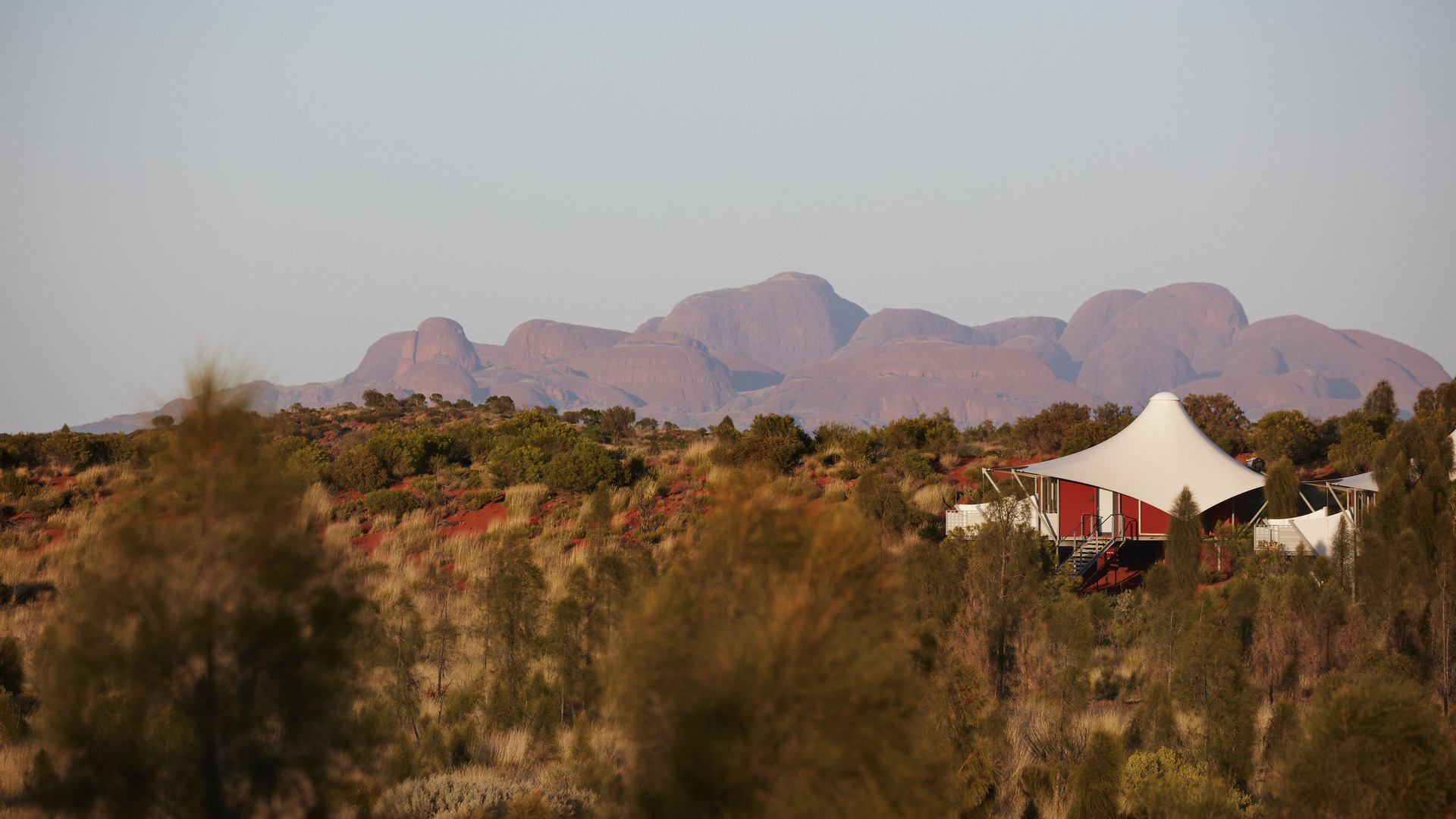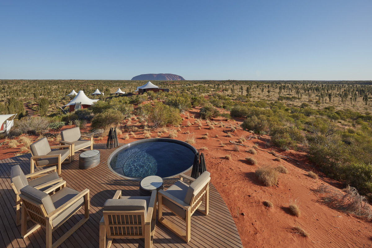 De lodge bestaat uit 16 luxueuze tentpaviljoenen, allemaal verspreid over de duinen en met een ononderbroken uitzicht op Uluru. Je kunt het geen kamperen noemen maar ervaart toch een subtiel knikje naar de outback-spirit. Je slaapt onder een canvas tentdak zonder te moten inboeten op comfort: kingsize bed, airco, zachte stoffen, een regendouche, kunst uit de regio en een minibar afgestemd op jouw voorkeuren.