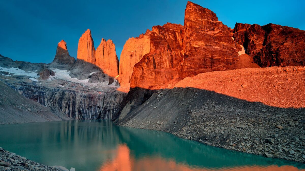 Torres del Paine is een paradijs voor wandelaars, met perfect bewegwijzerde paden en uitzichten die elke inspanning belonen. Voor wie van uitdaging houdt, is de trek naar Base de las Torres een absolute must. Vanuit Hotel Las Torres, waar je vannacht logeert, vertrekt het duidelijk gemarkeerde pad dat je in acht à negen uur heen en terug brengt naar de voet van de drie granieten torens. De klim van zo’n achthonderd meter vraagt wat uithouding, maar het uitzicht — de spiegeling van de torens in het turquoise meer — is onvergetelijk.