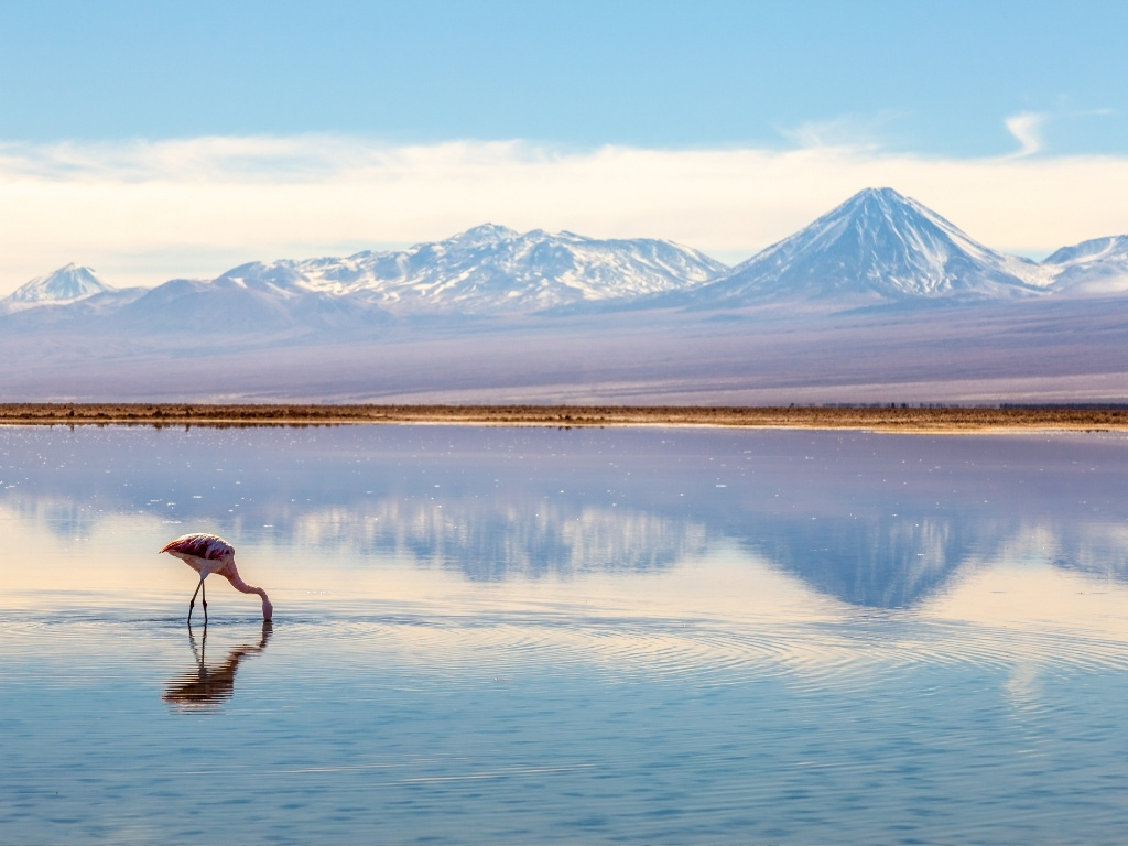Later op de dag rijd je naar de Salar de Atacama, een immense zoutvlakte waar de lucht zindert van stilte. Aan de Laguna Chaxa weerspiegelt het water de kleur van de avondhemel, terwijl flamingo’s langzaam door het ondiepe water stappen, op zoek naar algen en krill. Een zonsondergang die de Atacama nog dieper in je geheugen kerft.