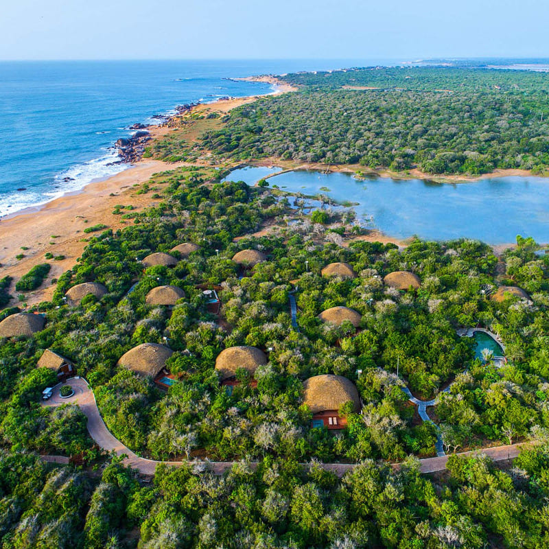 Later die dag ontdek je Yala vanuit een ander perspectief. Tijdens een bush walk langs de ruige kustlijn wandel je door een landschap dat als een wereld apart aanvoelt. Wilde stranden, duinen en rotsformaties vormen het decor waar alle vijf soorten zeeschildpadden hun eieren komen leggen. Samen met de rangers van de lodge volg je sporen van olifanten, wilde zwijnen en misschien zelfs van de zeldzame roestvlekkat. Hun kennis en verhalen brengen de natuur van deze bijzondere regio echt tot leven.