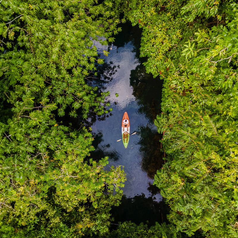 Onderweg stop je bij een grot, en daarna stap je in een kajak om op eigen tempo over het water te peddelen. Het is er stil, je hoort alleen het geluid van vogels en het klotsen van de peddel om je heen.