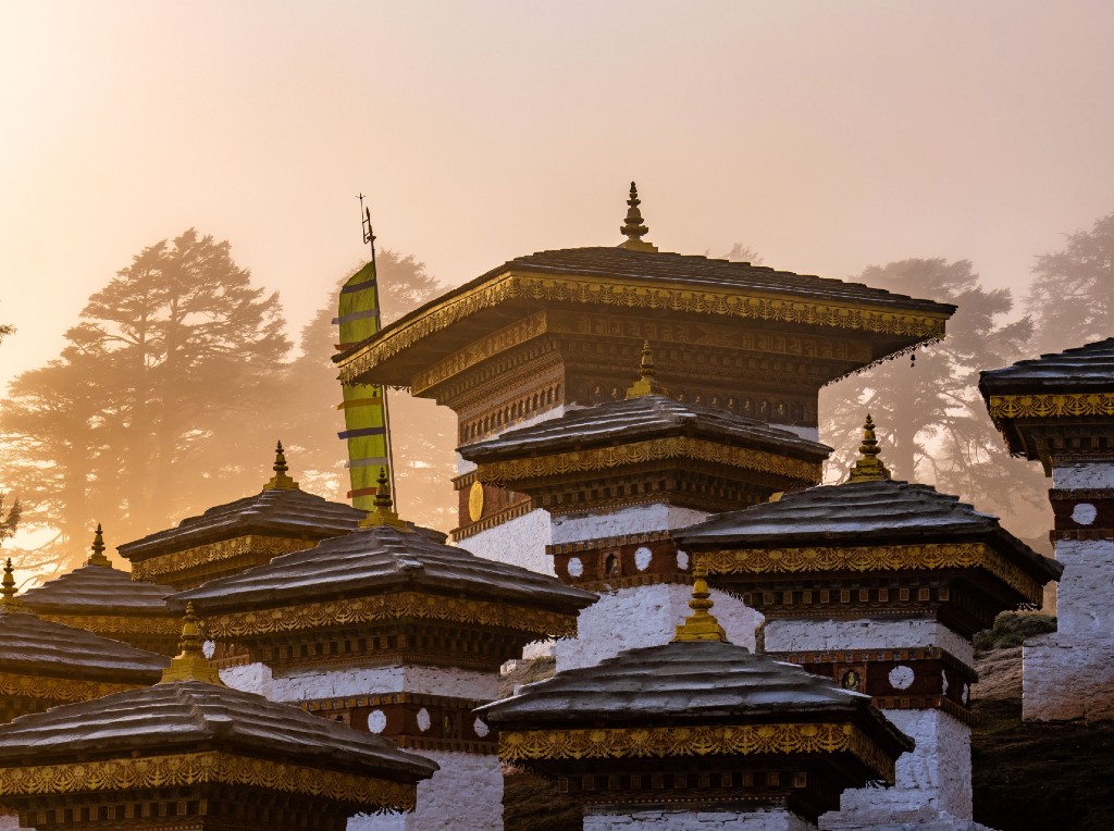 Vandaag rijd je over de schilderachtige Dochu La-pas, waar 108 witgestucte chorten waken over het landschap. Terwijl je klimt, ontvouwt zich een panorama van rododendronbossen en besneeuwde bergtoppen — een rit vol verstilling én verwondering. Je daalt af naar de weelderige Punakha-vallei, de voormalige hoofdstad van Bhutan. Daar bezoek je de majestueuze Punakha Dzong, prachtig gelegen aan de samenvloeiing van twee rivieren en nog steeds het winterverblijf van Bhutan’s hoogste boeddhistische autoriteiten. In de namiddag maak je een ontspannen wandeling langs terrasvelden naar de Chimi Lhakhang — de eigenzinnige tempel van de Divine Madman, die ooit het orthodoxe boeddhisme op zijn kop zette.