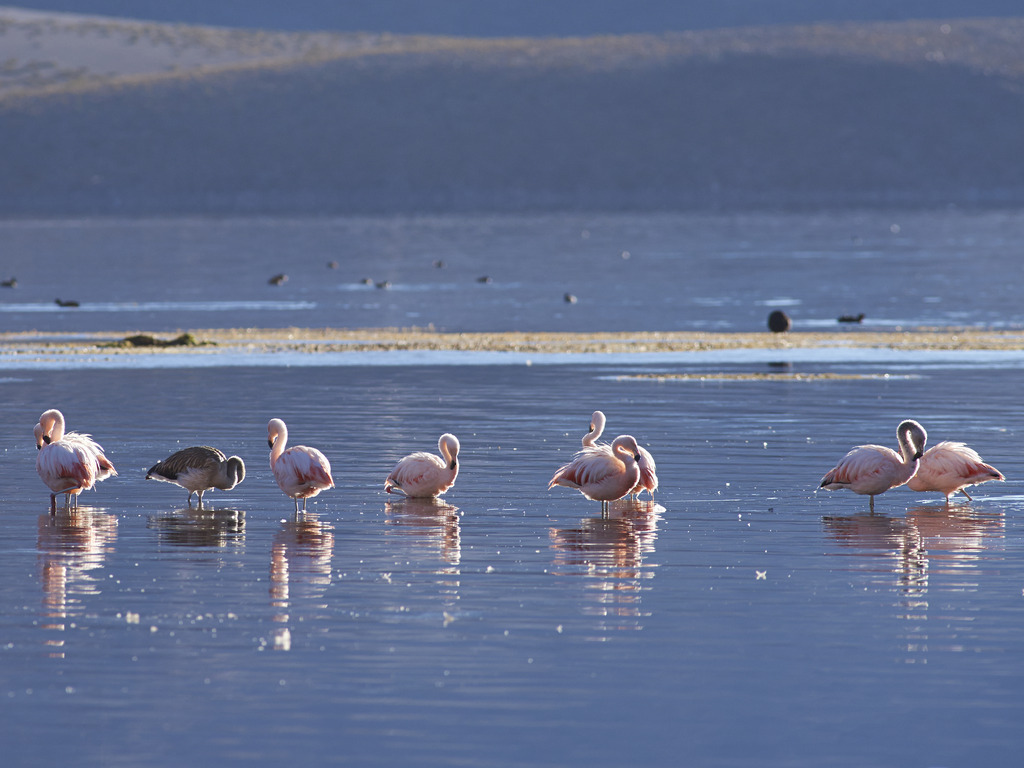 Vandaag trek je eropuit met je privégids. De bestemmingen: de Salar de Atacama, Laguna Chaxa en de lagunes Altiplánicas. Tijdens de rit langs de uitgestrekte zoutvlakte zie je hoe het aardoppervlak bijna loodrecht omhoog rijst, met een eindeloze keten van vulkaantoppen die samen de Ring van Vuur vormen. Vanuit het dorp Socaire voert een grindweg je hoger de Andes in, tot bij de twee saffierblauwe hooglandmeren Miscanti en Miñiques. Ze schitteren aan de voet van besneeuwde vulkanen, op meer dan 4100 meter hoogte.
