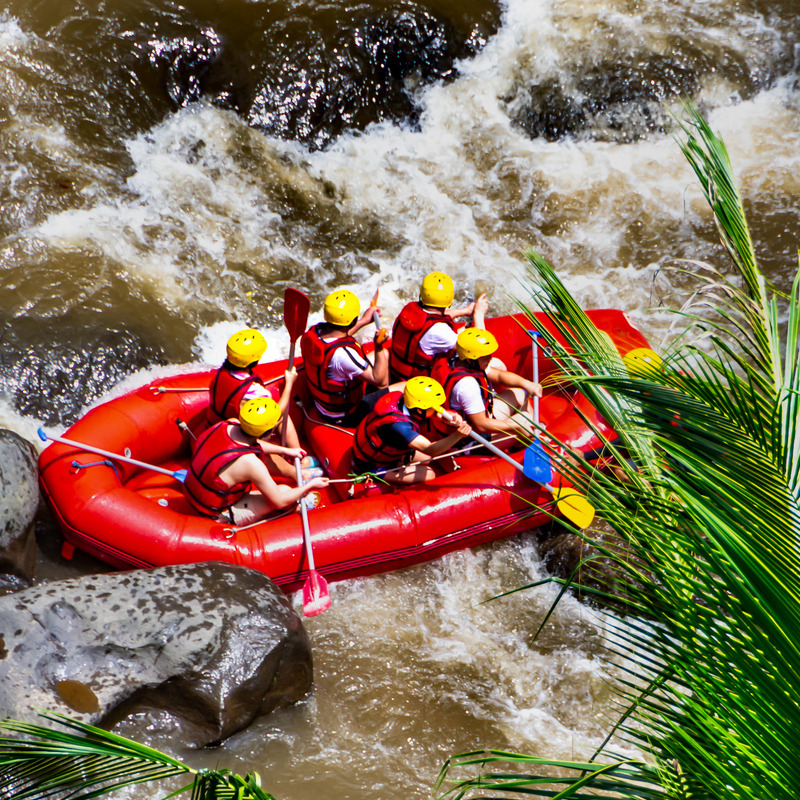 Liever een wateravontuur? Ga dan in de ochtend raften bij Ubud. De rivier slingert zich door kloven en regenwoud, met een perfecte mix van stroomversnellingen en rustige stukken waar je omringd wordt door vogelgezang en tropisch groen.