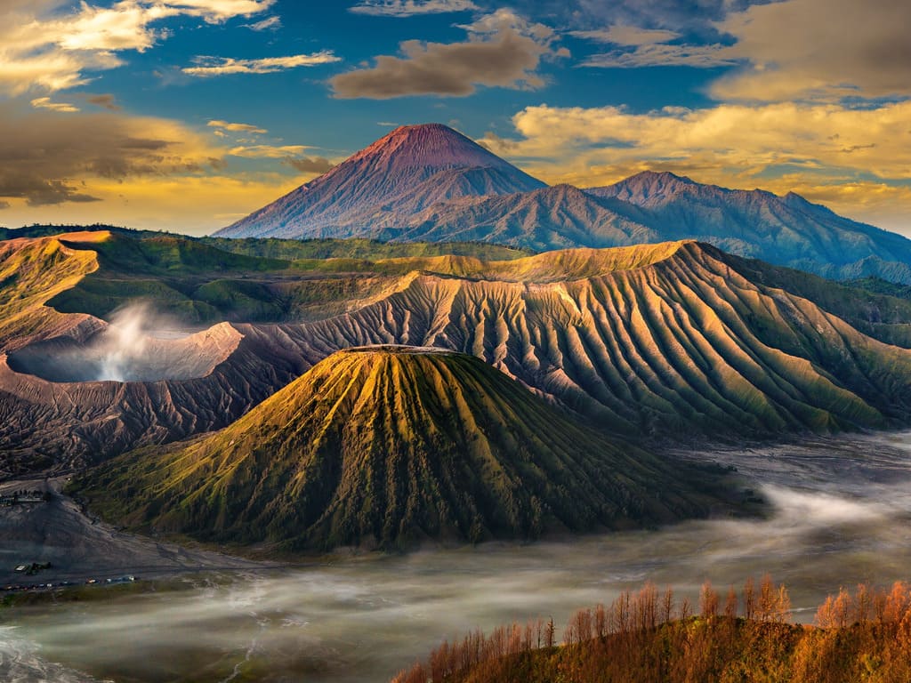 Nog voor zonsopkomst stap je in de jeep voor een korte, maar steile rit door het donker. Terwijl de lucht langzaam lichter wordt, kom je aan bij een uitkijkpunt met een van de meest legendarische panorama’s van Java. Het Bromo Tengger Semeru National Park strekt zich voor je uit: een maanachtig landschap van asvlaktes, de ‘Sea of Sand’, en daarboven de silhouetten van vijf vulkanen die uit de mist opdoemen. Het moment waarop de zon achter Mount Semeru opkomt en het landschap in goud kleurt, is ronduit magisch.
