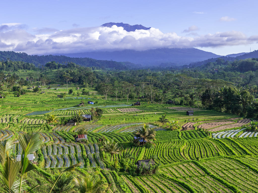 Na aankomst in Denpasar word je verwelkomd door je gids en rijd je landinwaarts naar Sidemen, een betoverende regio die vaak wordt omschreven als het Bali van dertig jaar geleden. Hier vind je geen drukke stranden of verkeer, maar groene valleien, rijstterrassen en dorpen waar het traditionele leven nog springlevend is. Je overnachtingsplaats ligt verscholen tussen de heuvels, met uitzicht op de omliggende rijstvelden en de machtige Gunung Agung op de achtergrond.