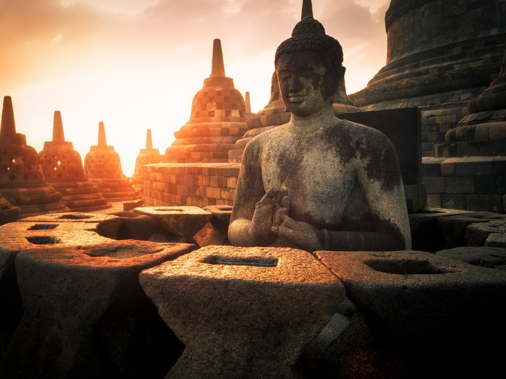 Daarna verken je de Borobudur zelf. Terwijl je langzaam omhoogklimt langs de galerijen, ontdek je de vele reliëfs en sculpturen die het levensverhaal van Boeddha uitbeelden. Boven, tussen de stoepa’s, krijg je een indrukwekkend zicht over de Kedu-vlakte met rijstvelden en vulkanen op de achtergrond.