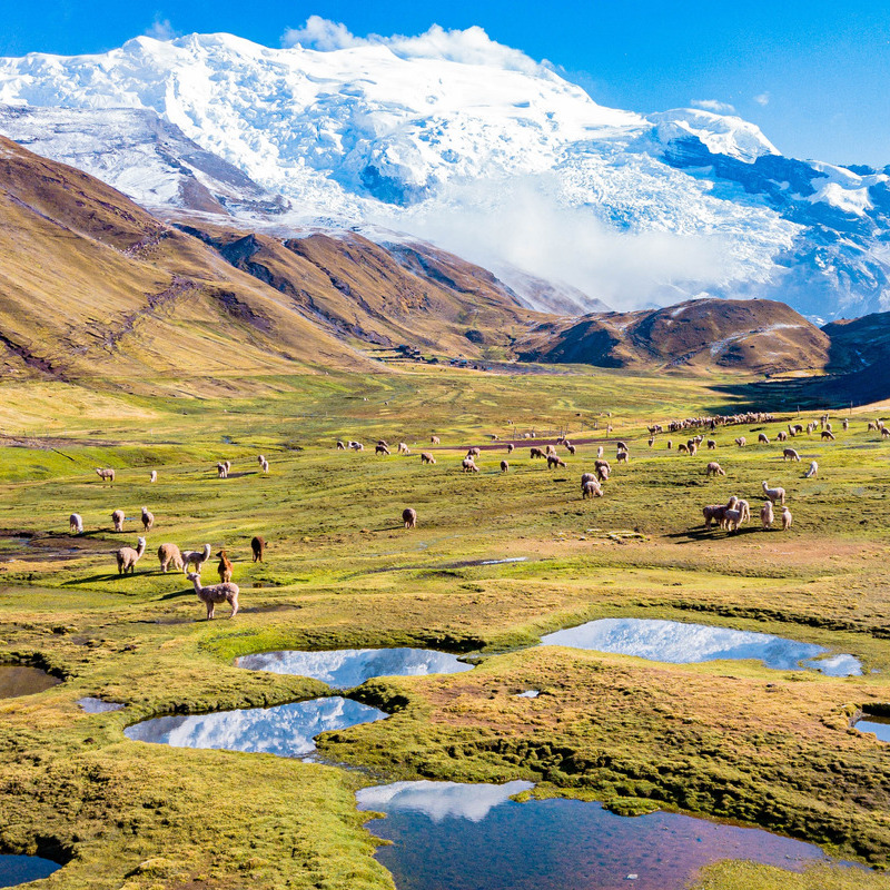 De tocht voert je door het ruigste en meest authentieke deel van de Andes. Je wandelt langs glinsterende bergmeren, door frisgroene valleien en onder gletsjers die in het zonlicht blauw oplichten. Onderweg kruis je rondtrekkende herders met hun kuddes alpaca’s. Tijd lijkt hier nauwelijks te bestaan.