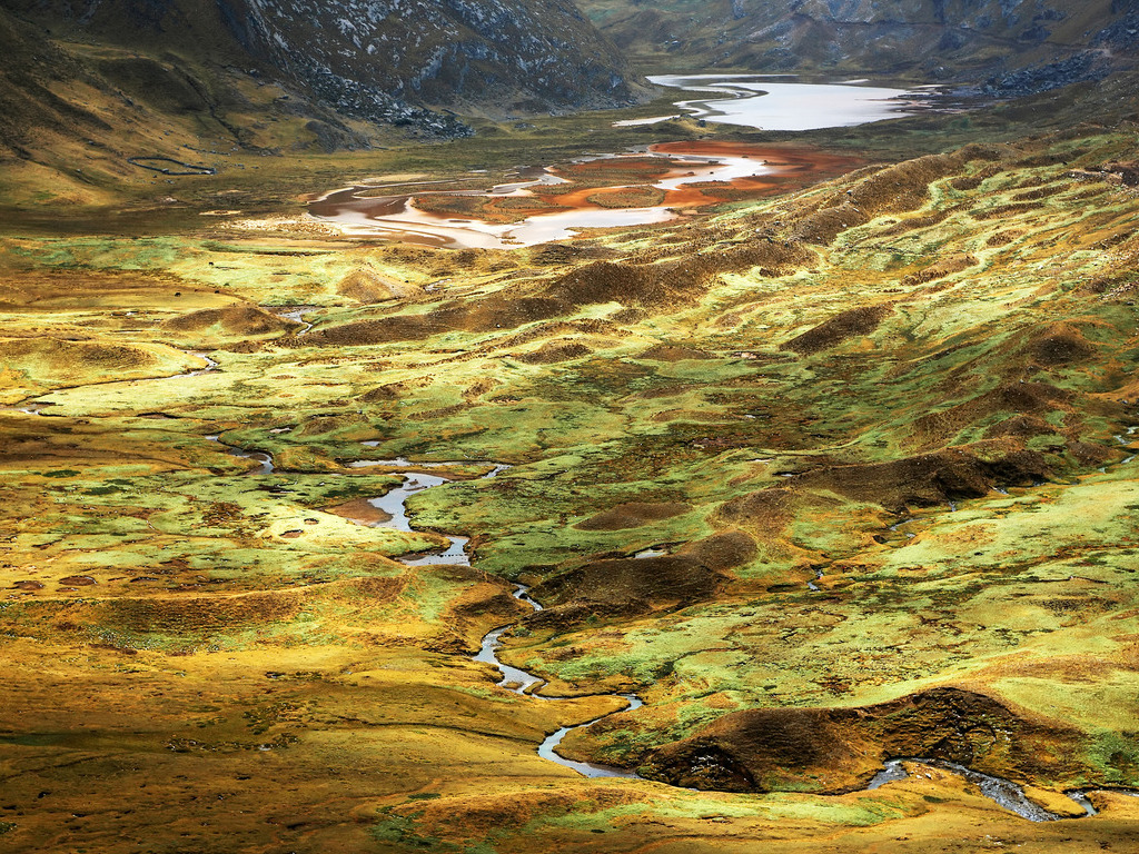 Daarna volgt een afdaling van drie à vier uur door hoogveenlandschappen, langs kuddes lama’s en alpaca’s die loom door het gras bewegen. Aan de oevers van het Viconga-meer (4480 m) wacht je kamp, met natuurlijke warmwaterbronnen waarin je spieren heerlijk tot rust komen na een lange wandeldag.