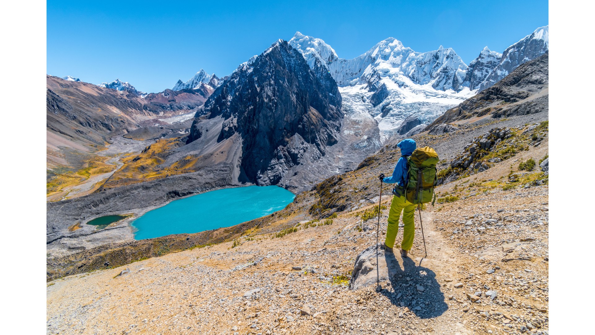 Wandelaar op hooggelegen pad met besneeuwde berg in Huaraz, Peru – reizen met Explore.